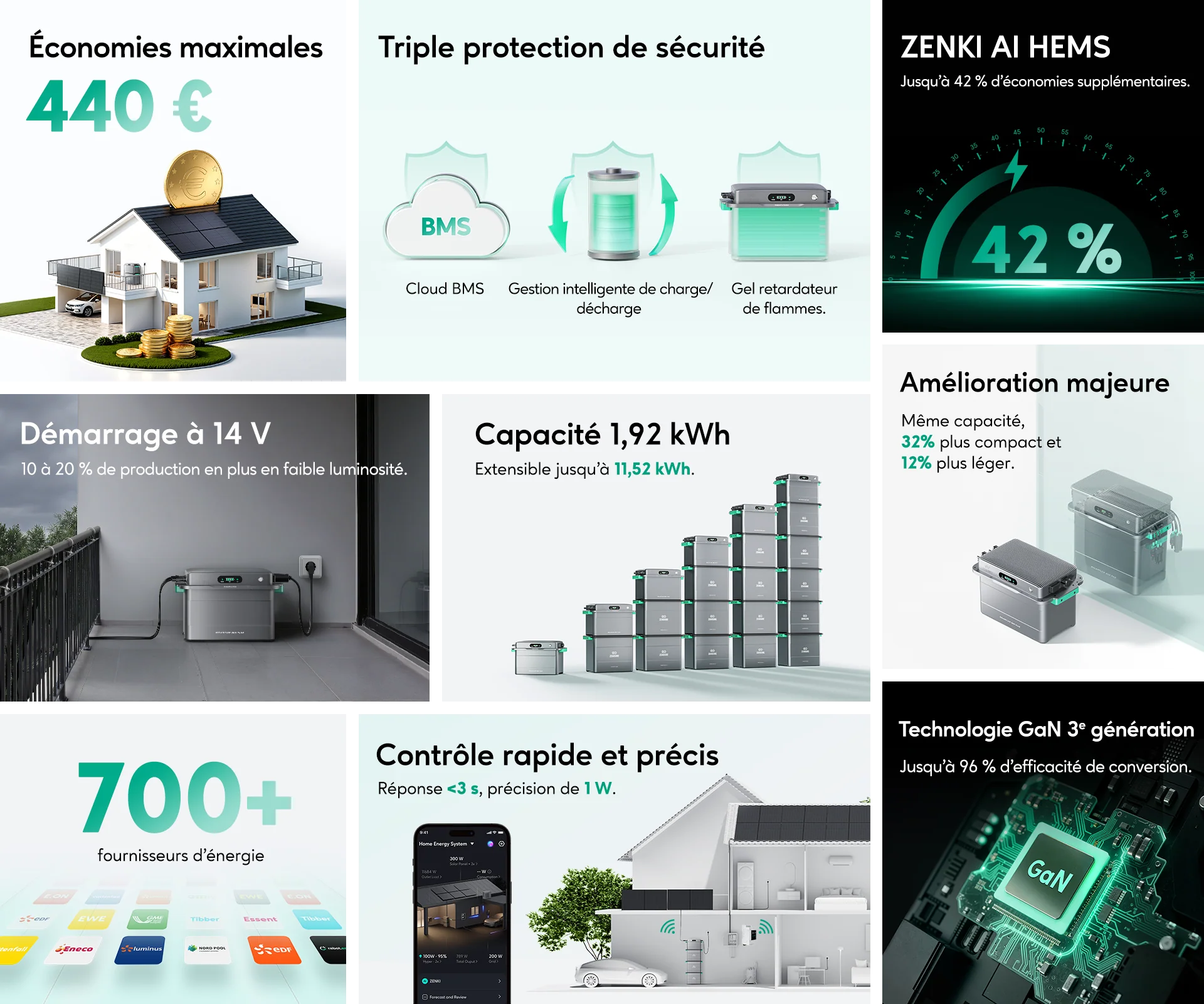 Capacité évolutive jusqu’à 11,52 kWh : Grâce à sa batterie de base de 1,92 kWh et à la possibilité d’ajouter jusqu’à cinq modules supplémentaires, le système peut atteindre 11,52 kWh. Une solution idéale pour renforcer l’autoconsommation ou couvrir des besoins énergétiques plus élevés.